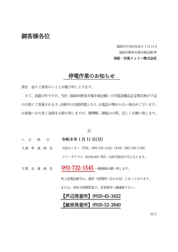 本社停電に伴う、ご案内