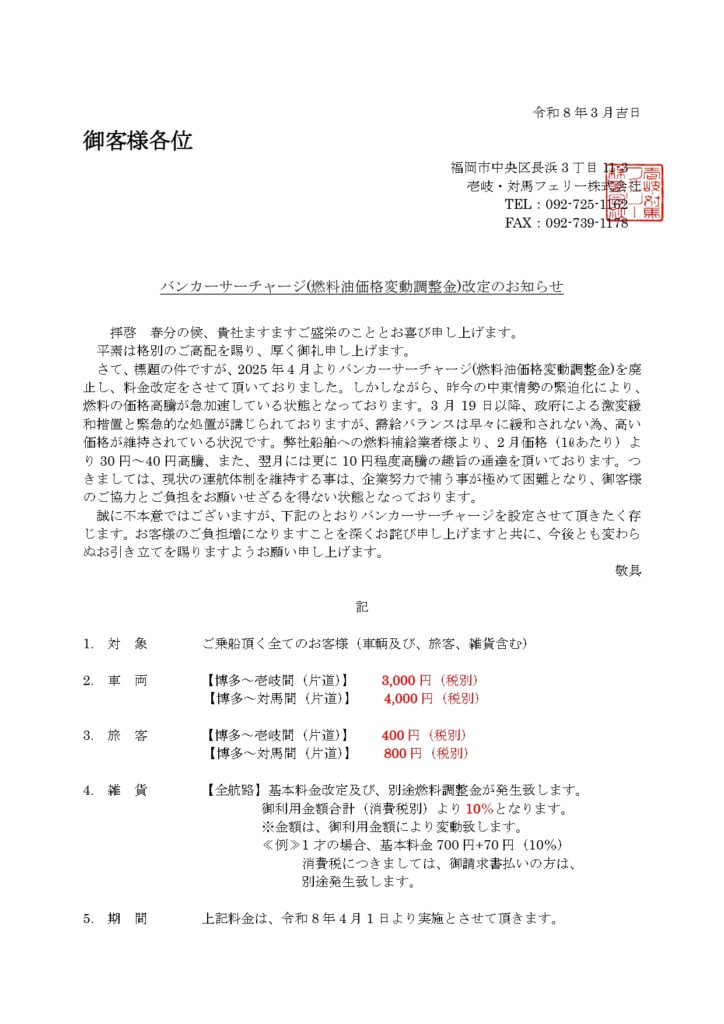 令和8年4月1日(水)より燃料調整金が発生致します。