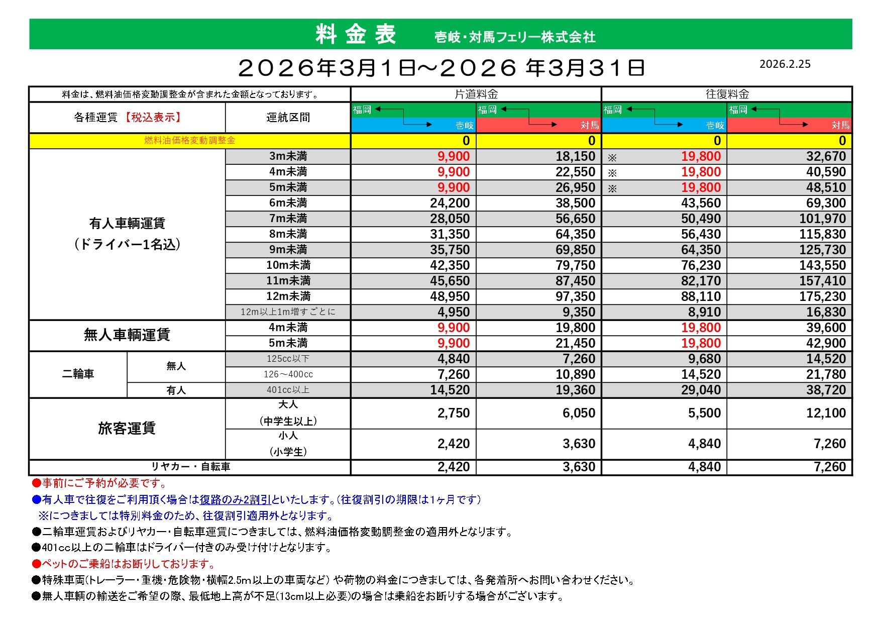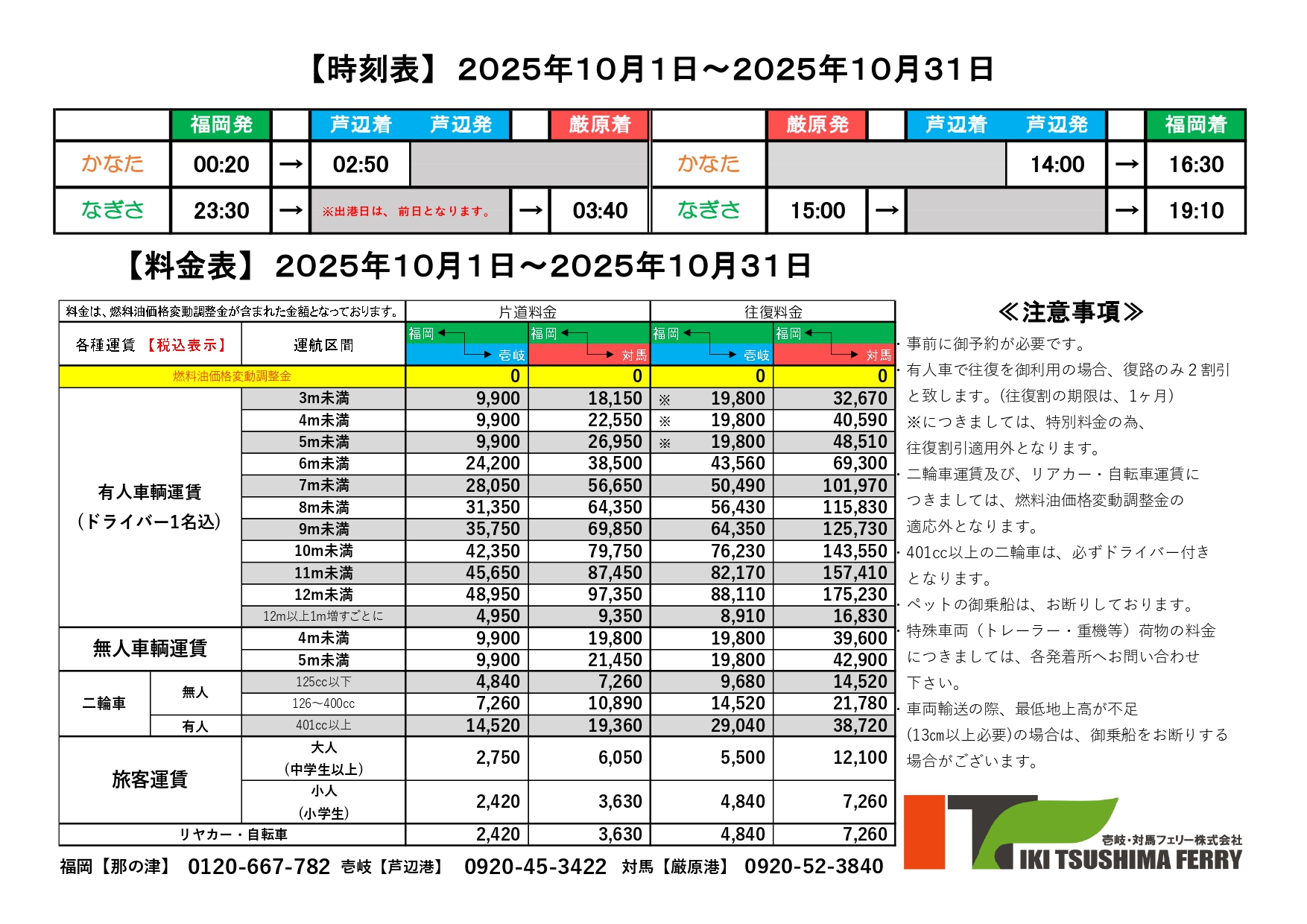 ※本料金表には燃料油価格変動金及び消費税10%が含まれています。